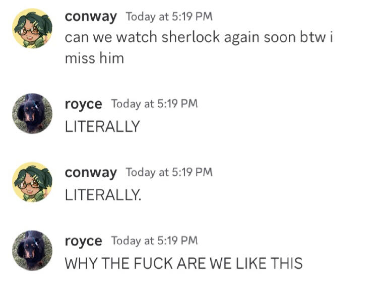i like bbc sherlock and talk abt it in a funny way but im not a superwholock in 2024 ok.favorite characters